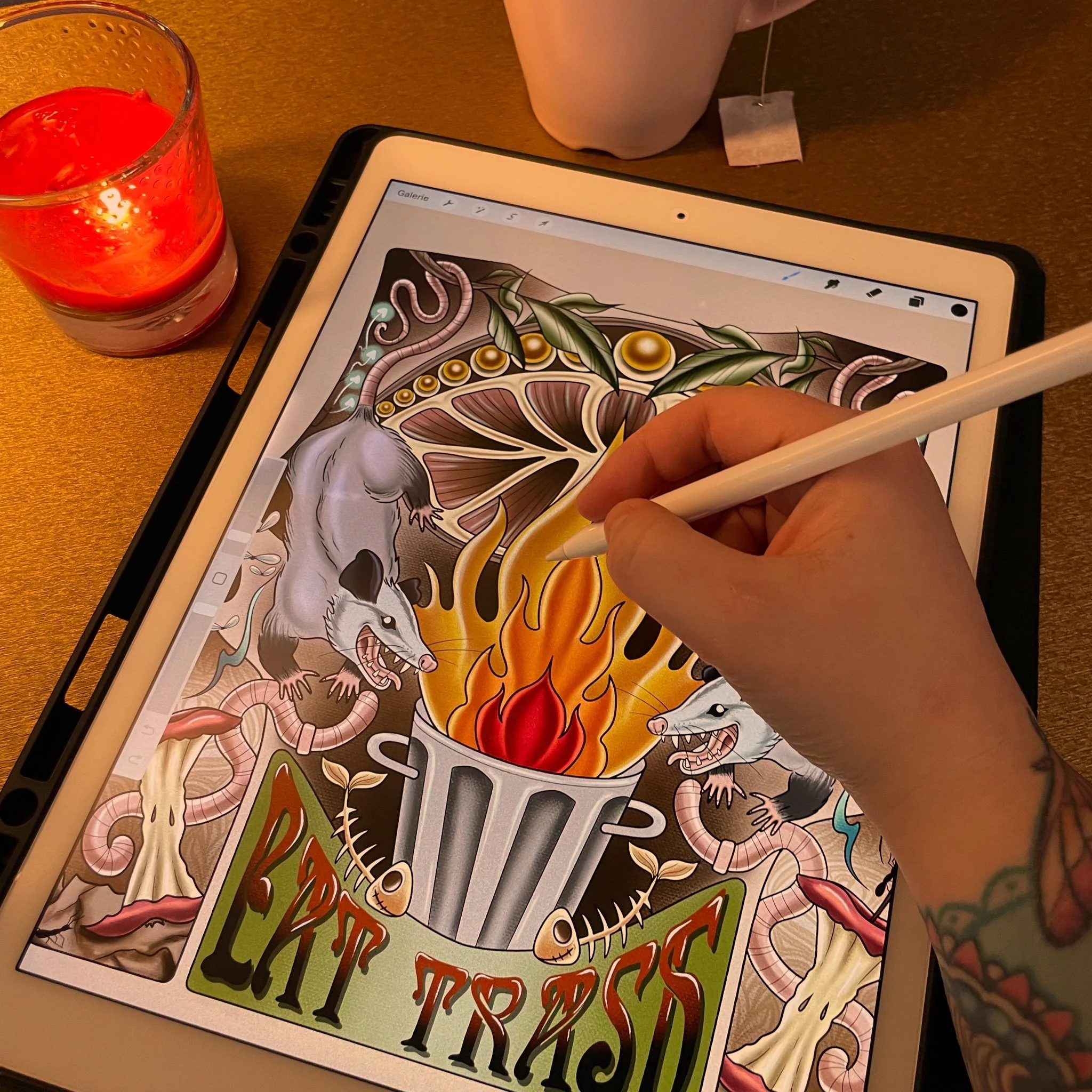 Mit 23 Jahren ließ ich mich zum allerersten Mal selbst tätowieren, und mir war fortan klar: Ich will Teil dieser aufregenden Kunstbewegung sein, und zwar nicht nur als Kundin! In meiner Ausbildung durfte ich allerhand Stilrichtungen kennenlernen und lieben lernen. Allerdings verspüre ich eine ganz besondere Begeisterung für illustrative Designs und die individuellen, einzigartigen Geschichten hinter einem Tattoo.